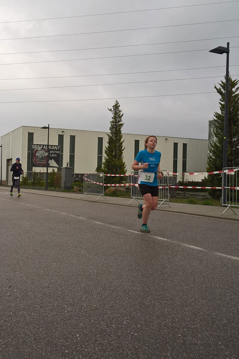 Ich beschleunigte noch einmal und 2 km vorm Ziel, als die Strecke langsam flacher wurde, setzte nun leider der Regen ein! Blöd für die Zuschauer an der Strecke, die sich dann auch lieber in Richtung Halle aufmachten. Nun Endspurt und eine letzte Runde durch die Wassergärten – und plötzlich sah ich eine weitere Frau hinter mir (aber nicht die von km 1). Nun also nochmal Gas geben, denn auf den letzten Metern überholt zu werden, macht keinen Spaß! Und mit einem kleinen Schlußsprint erreichte ich dann auch als erste Frau das Ziel – und das nach dem 100 km Vogesen Abenteuer knapp eine Woche vorher!